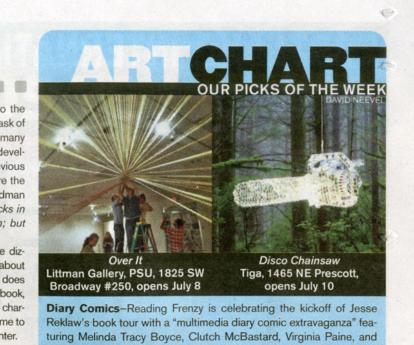 I'm all over the art chart! Over It, the group show, opens tonight (7/8/10) at the Littman Gallery. The Disco Chainsaw opens Saturday the 10th at Tiga. Let's party!