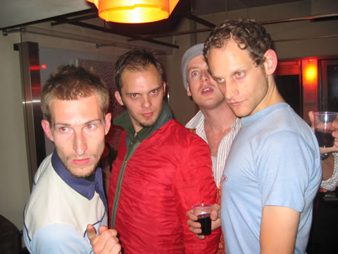someone threw a "red" party. this here's justus and his crew at that party. that's elliot on the left, gabe on the right, justus in the red, and also the guy whose name i forgot. he's nice though.